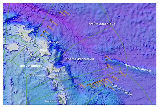 La répartition de la température au sein de la plaque plongeante est un paramètre important pour étudier les zones sismogénes (les régions susceptibles de générer des séismes). La seconde partie de cette mission est donc dédiée à la structure thermique du segment Nord de la zone de subduction des Petites Antilles. Une première série de mesures alignées sur un profil NE-SO a été effectuée au Nord de l’île de Barbuda depuis l’avant-arc jusqu’à la croûte océanique de la plaque Amérique du Nord en passant par la fosse de subduction. Une seconde série de mesures ont été rélaisées à l’Est de la Guadeloupe et de la Martinique sur la plaque plongeante dans la région des rides de Barracuda et de Tiburon. Enfin une dernière série de mesures a été acquise le long d’un profil NE-SO au large de la Martinique depuis le front de déformation jusqu’à la partie supérieure de la marge (Figure 1).