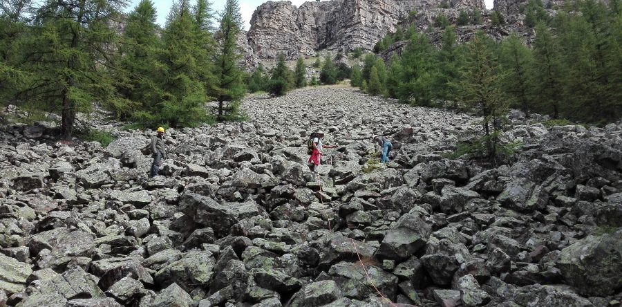 le câble kevlar se déroule de son touret en bas de l’éboulis Nord